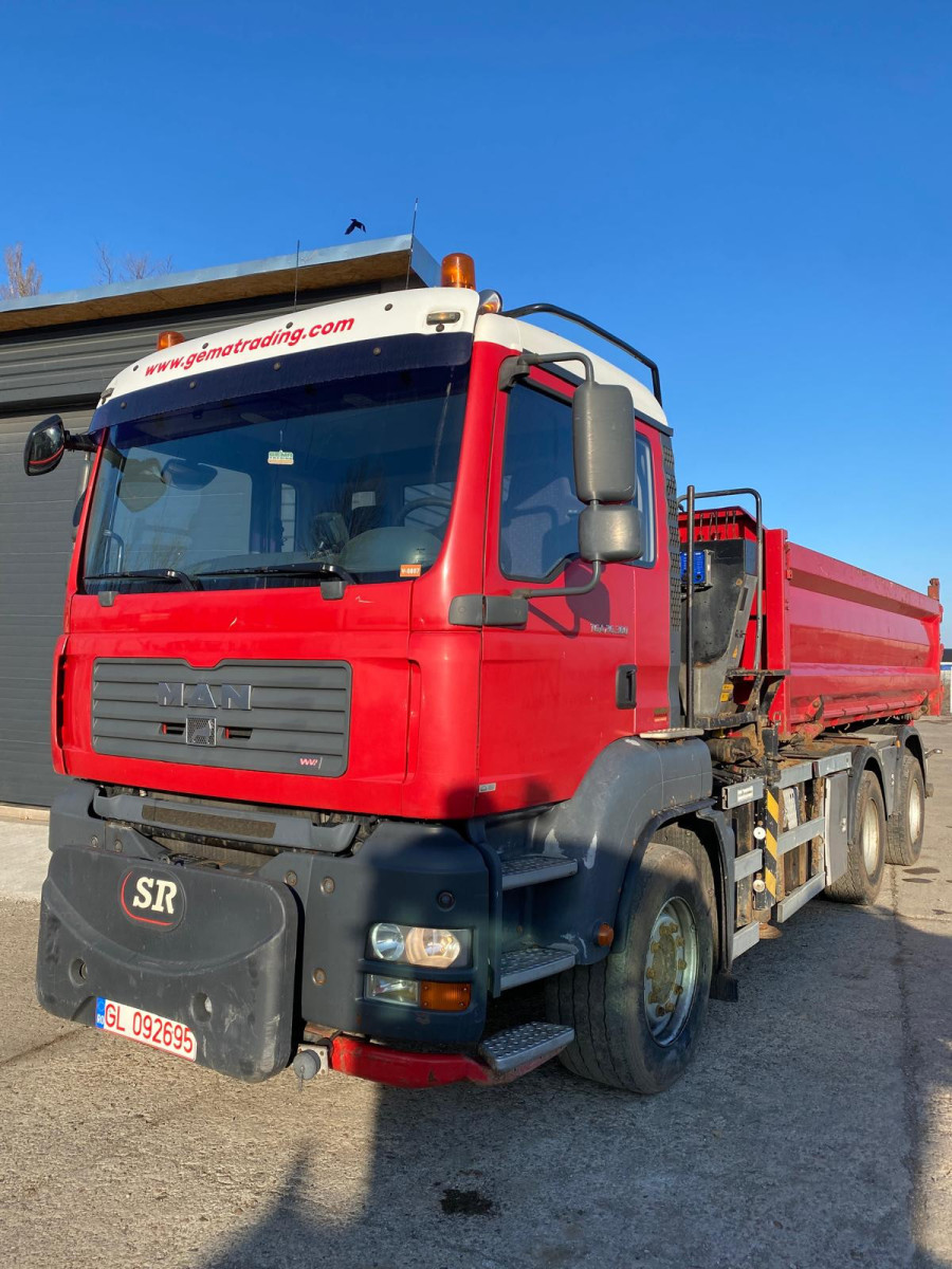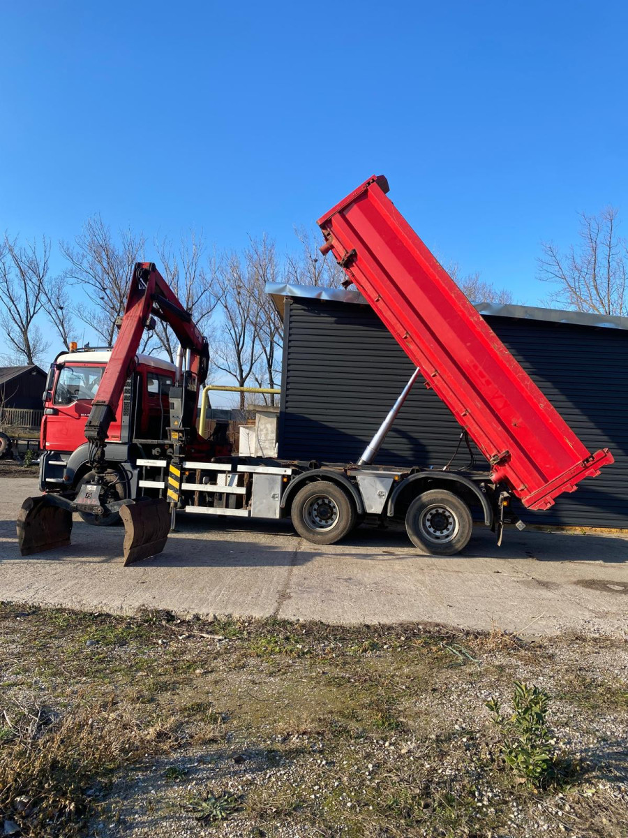 Camion Man cu macara, basculabil pe două părți, Bena Hardox cu uși franceze spate și oblon lateral acționat hidraulic, sarcina utilă 17 tone.