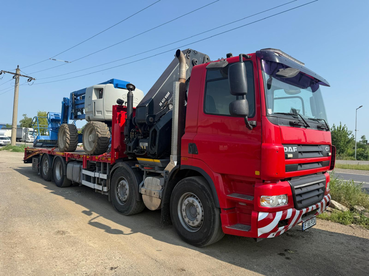Camionul este dotat cu rampe de încărcare, troliu pentru urcarea utilajelor pe platformă și prindere specială pentru containere maritime, asigurând manipulare sigură și eficientă.